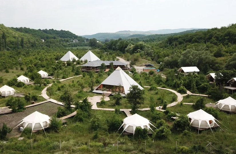 В Крыму, среди гор и грушевого сада, находится Ananda Glamping — место, куда едут за медитативными практиками и концертами этнической музыки. Гости располагаются в шатрах или сафари-тентах. И те и другие оборудованы сплит-системами, кроватями, душем, санузлом, верандами. На территории лагеря находится бассейн, баня и сердце глэмпинга — пирамиды, в которых проходят самые разные практики: этнические концерты, йога, мастер-классы, тренинги. А еще тут работает ресторан, где подают сугубо вегетарианские блюда.