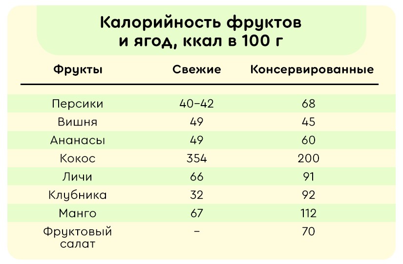 Не делает чести консервированным фруктам и сахар: он присутствует в сиропе и добавляется дополнительно в качестве консерванта. В результате его содержание в несколько раз выше, чем в свежих фруктах.