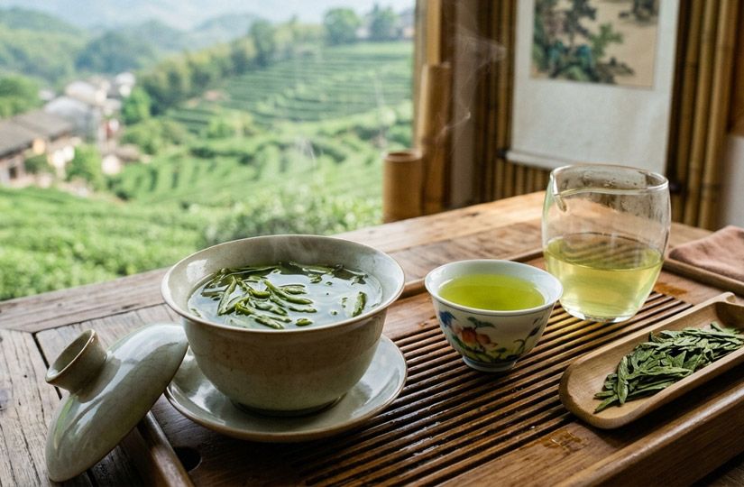 Лунцзин (в переводе — «колодец дракона») — плоские листья содержат рекордное количество катехинов и витамина С. Напиток обладает мягким ореховым вкусом со сладостью и растительными оттенками.