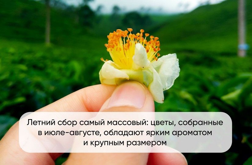 Летний сбор самый массовый: цветы, собранные в июле-августе, обладают ярким ароматом и крупным размером. Нераспустившиеся бутоны собирают рано утром, еще до рассвета, после чего отвозят на фабрику. Там бутоны подсушивают и дают им расцвести при температуре 32–37°С, после чего смешивают с заранее подготовленными листьями зеленого чая и начинают процесс ароматизации.